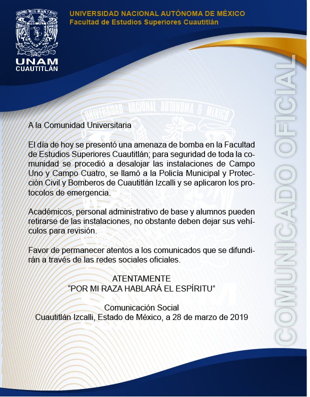 La Facultad de Estudios Superiores (FES) Cuautitlán de la UNAM, fue desalojada tras recibir una amenaza por una supuesta bomba en su interior.Fue a través de su cuenta oficial de Twitter que la institución educativa informó que fueron desalojados los campos uno y cuatro a fin de garantizar la seguridad de toda la comunidad escolar y académica.