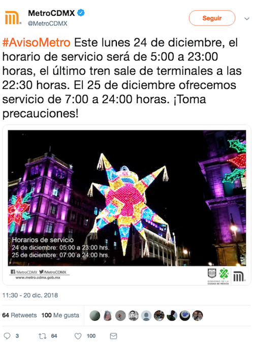 En la cuenta de Twitter @MetroCDMX se anunció que el 24 de diciembre el servicio será de 5:00 a 23:00 horas.