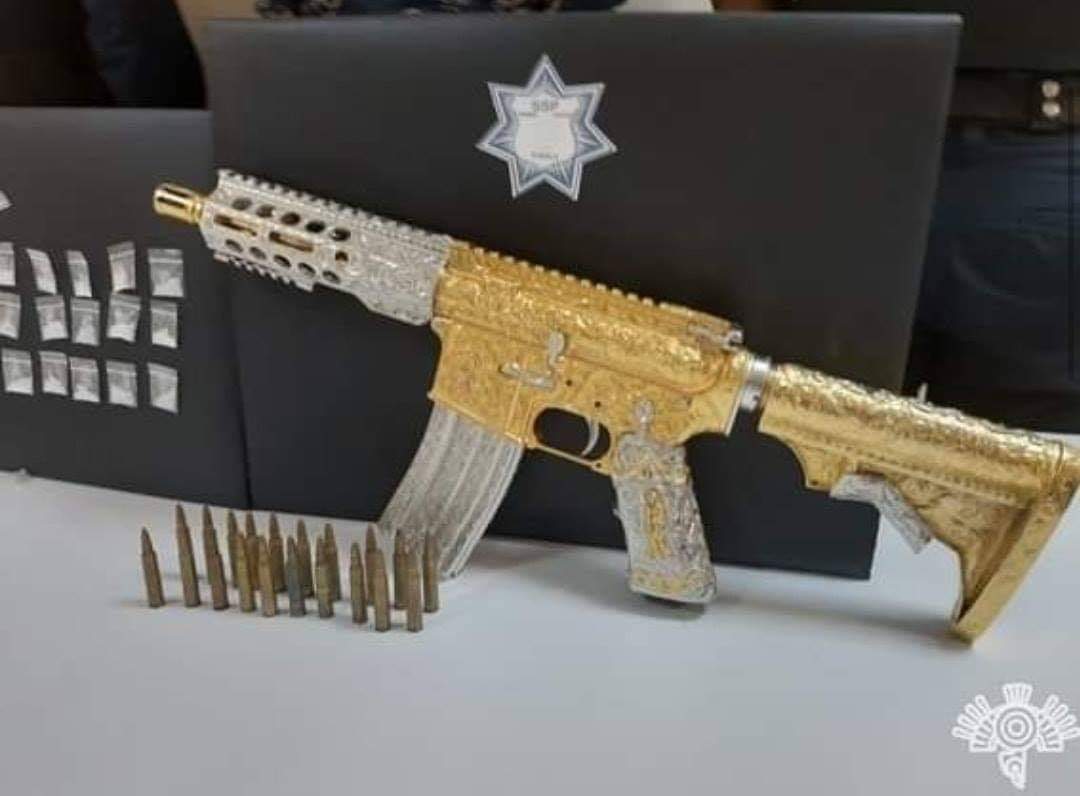 La Secretaría de Seguridad Pública Estatal de Puebla informó sobre la detención de un sujeto que portaba un rifle de asalto con incrustaciones de oro y varias dosis de droga conocida como cristal.