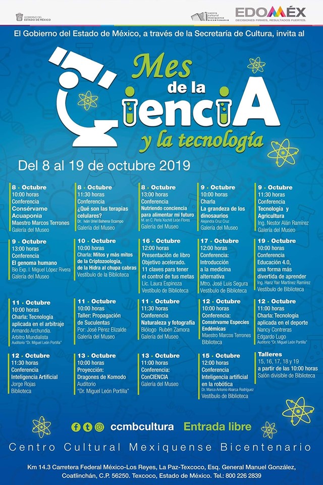 El Centro Cultural Mexiquense Bicentenario (CCMB), en Texcoco, celebrará mes de la ciencia y la tecnología del 8 al 19 de octubre, donde se llevarán a cabo actividades como conferencias, charlas, proyecciones y talleres, entre otras.