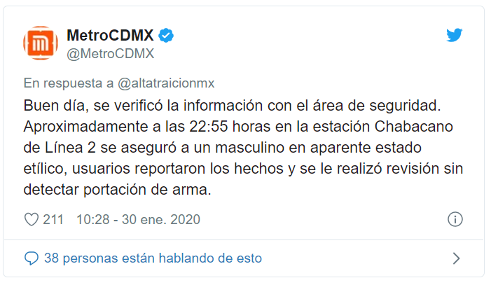 Por su parte, el Metro informó que aproximadamente a las 22:55 horas detuvo a un hombre en aparente estado de ebriedad, en la estación Chabacano de la Línea 2. Aunque explicó que al sujeto se realizó una revisión y no se detectó portación de arma.