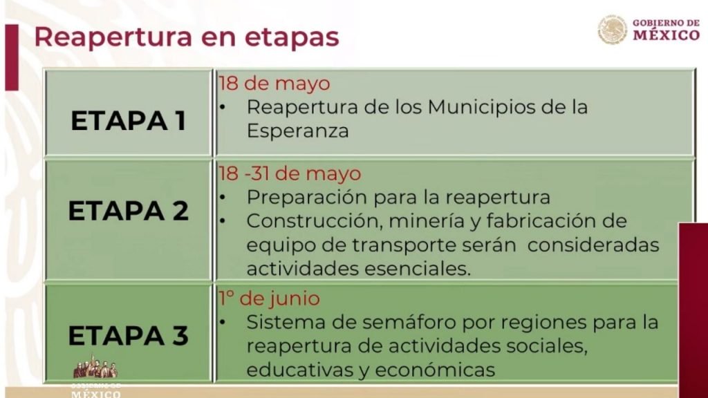 El gobierno federal anunció esta mañana el plan de regreso a la actividades que se dará de forma gradual, ordenado y cauto», a partir del 18 de mayo y se dividirá en tres etapas hasta llegar al 1 de junio.