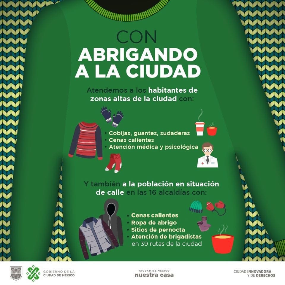 La secretaria de Inclusión y Bienestar Social (SIBISO) de la Ciudad de México, Almudena Ocejo, anunció que ya han repartido 60 mil de un total de 200 mil cobijas, 60 mil raciones de pan y café y han entregado 180 mil cenas calientes para las personas en situación de calle, como parte del programa «Abrigando a la Ciudad.»