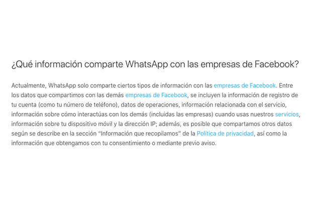 WhatsApp comparte información con Facebook y en específico que la información de WhatsApp Business se alojará en la infraestructura con Facebook.