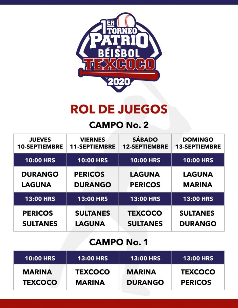 Respetando las medidas sanitarias de distanciamiento social y a puerta cerrada, se realizará en Texcoco el 1er Torneo Patrio de Béisbol Texcoco 2020, del jueves 10 al domingo 13 de septiembre.