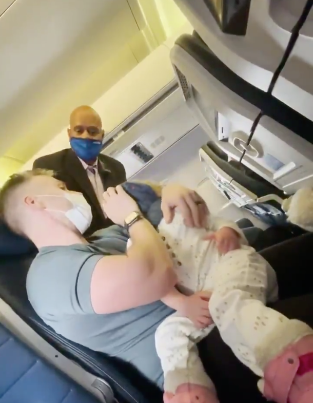 Un agente se acerca a la pareja para pedirle a la familia que se retire del vuelo. Los padres de la niña intentan convencer al agente que hicieron todo lo posible para cumplir las reglas, pero éste no se dejó persuadir.