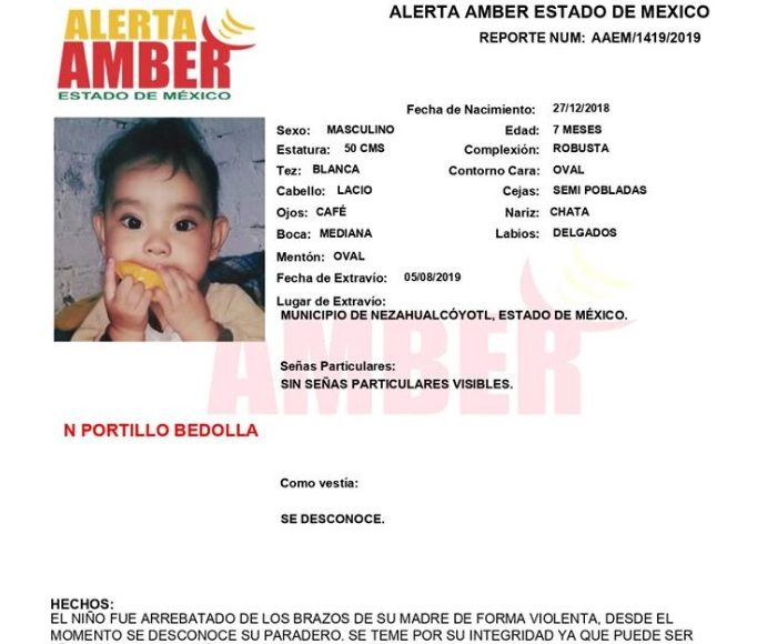 De acuerdo con reportes policiales, el menor fue arrebatado de las manos de su madre en calles de la Colonia Estado de México, el pasado 5 de agosto y la Alerta Amber comenzó a circular.