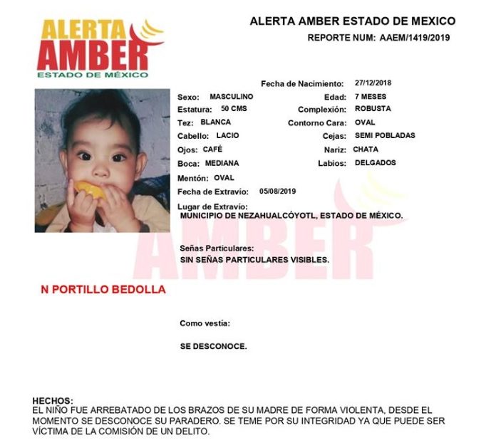 Este lunes la Fiscalía General de Justicia del Estado de México (FGJEM) emitió una Alerta Amber para localizar a un bebé de siete meses que fue robado en el municipio de Nezahualcóyotl.