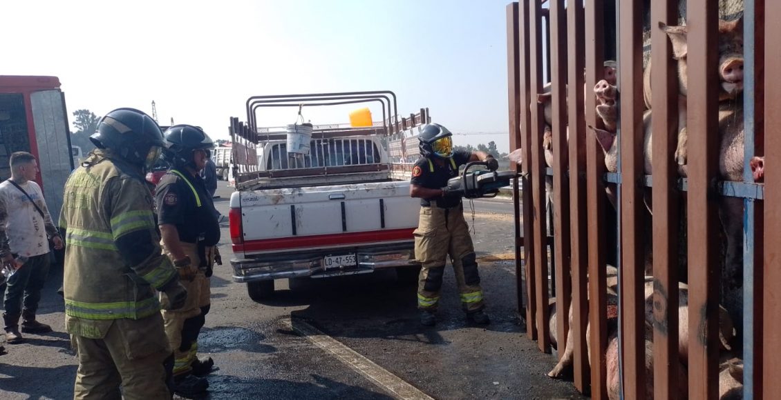Tras el rescate del conductor, elementos del cuerpo de Bomberos con equipo especial se dieron a la tarea de romper las jaulas, para el rescate de los cerditos, que estaban sufriendo por la volcadura.