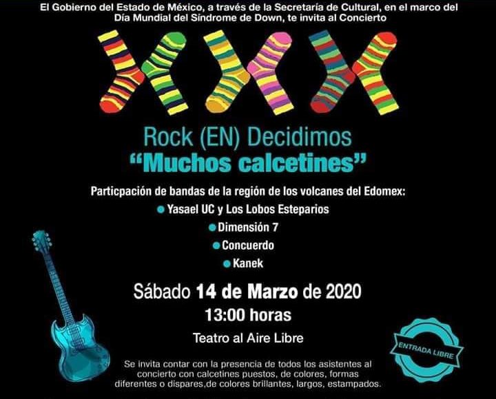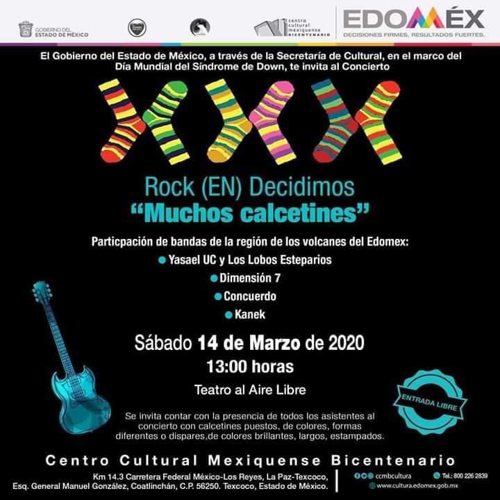 El Centro Cultural Mexiquense Bicentenario será sede el próximo sábado 14 de marzo a partir de las 13:00 horas del concierto de rock «Muchos Calcetines», alusivo al día mundial del Síndrome de Down, el evento es organizado por la Secretaría de Cultura del Estado de México y la Comisión de Derechos Humanos del Estado de México en favor de la concientización hacía las personas con discapacidad.