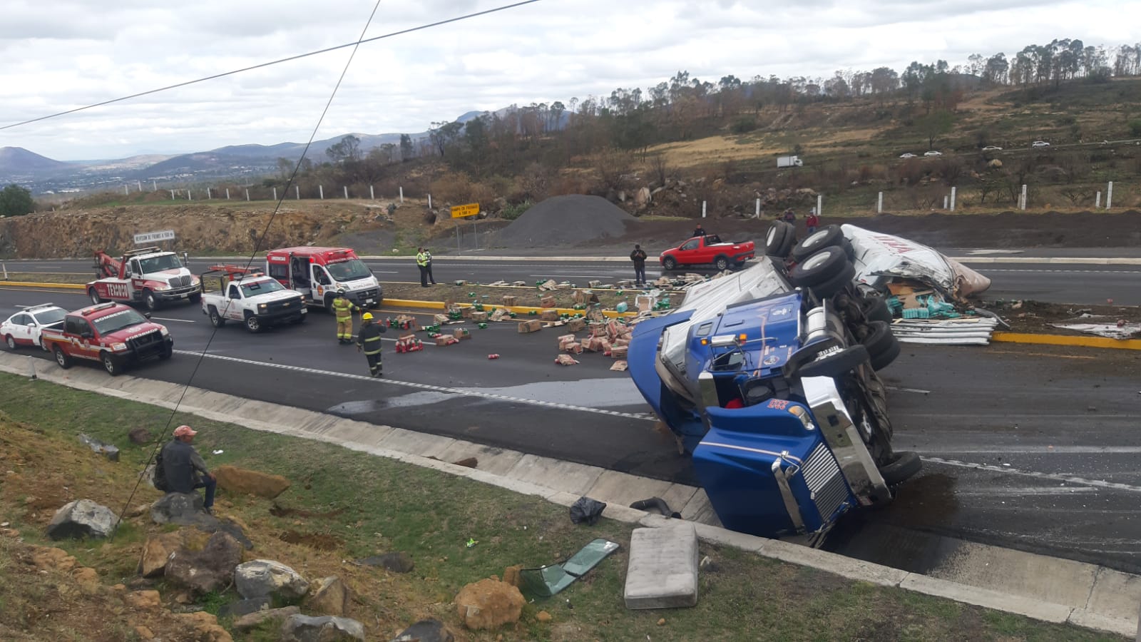 Bomberos de Texcoco permanecen en espera de que levanten el tractocamión, la caja y los productos de limpieza, los que fueron respetados por vecinos y ciudadanos sin que se registrara rapiña, para limpiar la cinta asfáltica y poder reabrir la carretera, como alternativa está la vieja carretera a Calpulalpan.