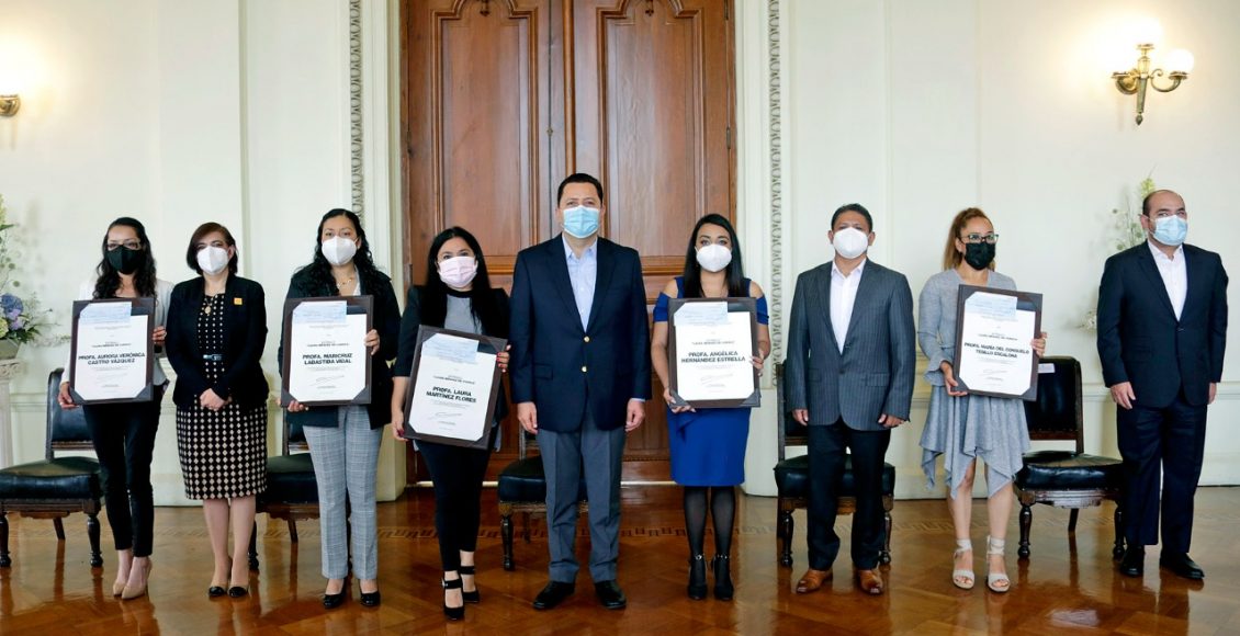 Las docentes galardonadas son Angélica Hernández Estrella, de USAER 230, Tlalnepantla, Verónica Castro Vázquez, del Jardín De Niños “Estefanía Castañeda”, Amecameca, Laura Martínez Flores, de la Escuela Primaria “Lic. Benito Juárez”, Ecatepec, Maricruz Labastida Vidal, de la Secundaria “Mahatma Gandhi”, Naucalpan, y María del Consuelo Tesillo Escalona, del Centro de Bachillerato Tecnológico “José Antonio Alzate”, Temascalapa.