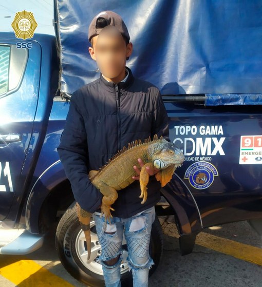 El joven intentó huir con el reptil en brazos pero fue detenido al no acreditar la posesión legal del animal, por lo que fue trasladado al Ministerio Público de la Fiscalía Especializada en Delitos Ambientales, mientras la iguana se encuentra en la Brigada de Vigilancia Animal de la SSC.