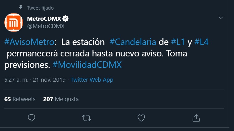 A través de su cuenta en Twitter @MetroCDMX señaló: “permanecerá cerrada la estación Candelaria de las Líneas 1 y 4”.