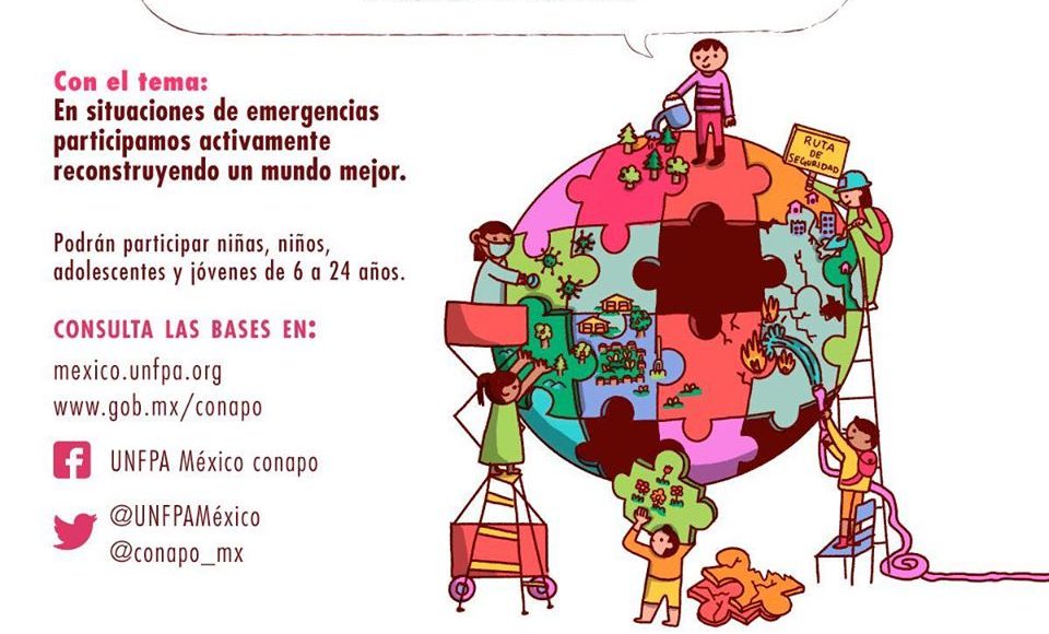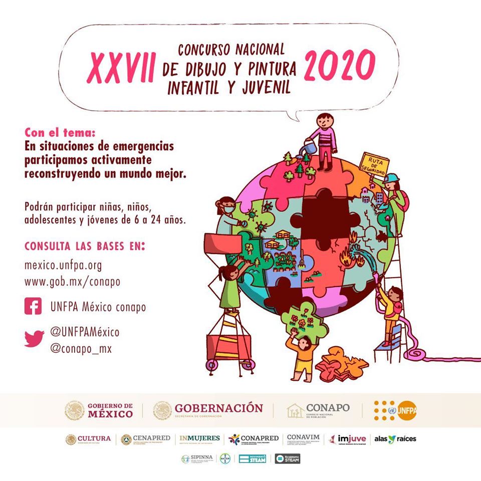El Consejo Estatal de Población (Coespo), convoca a los mexiquenses que radican en la entidad, a participar en el 27° Concurso Nacional de Dibujo y Pintura Infantil y Juvenil 2020 “En situaciones de emergencias, participamos activamente reconstruyendo un mundo mejor”.