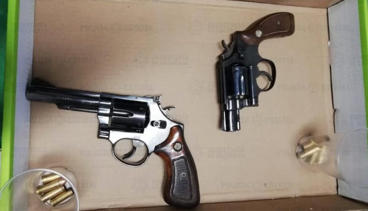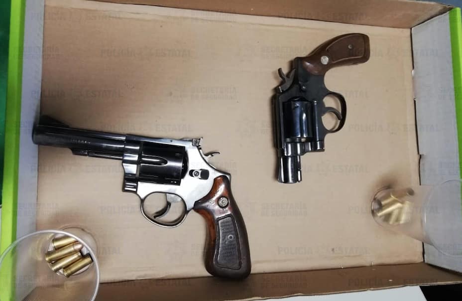 Los elementos de la Policía Estatal detuvieron metros después a Jesús Alejandro “N”, de 20 años, así como a Héctor “N” y Héctor “N”, ambos de 30 años de edad, a quienes después de una revisión preventiva les localizaron entre sus pertenencias dos armas de fuego: una Smith & Wesson calibre .38, abastecida con cinco cartuchos, y otra marca Taurus 38 Special, con cuatro cartuchos.