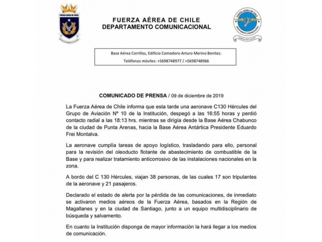 Un avión militar C130 con 38 personas a bordo desapareció este lunes tras salir de la ciudad de Punta Arenas, en el extremo austral de Chile, con destino a una base en la Antártida, informó un comunicado de la Fuerza Aérea de Chile.