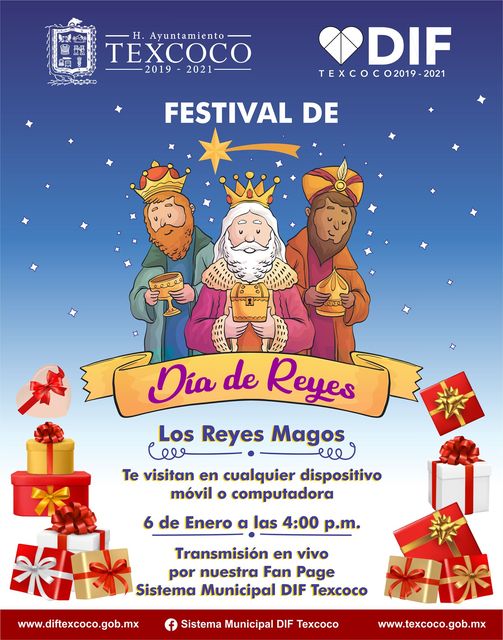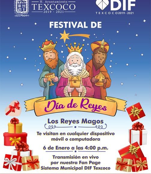 La Directora del DIF Texcoco Magdalena Moreno Vega, informó que el festival de Día de Reyes, tendrá lugar este 6 de enero a partir de las 16:00 horas, y podrán seguirlo a través de la cuenta de facebook Sistema Municipal DIF Texcoco y las páginas web www.diftexcoco.gob.mx y wwwtexcoco.gob.mx.