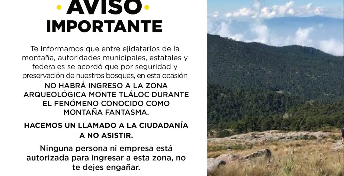 La Secretaria del Medio Ambiente y Recursos Naturales, la Comisión Nacional de Áreas Naturales Protegidas (CONANP), Probosque Estado de México, el gobierno de Texcoco y la Unión de ejidos Monte Tláloc hacen un llamado a toda la población de Texcoco, del Valle de México, Puebla Tlaxcala, a turistas, empresas turísticas y cualquier persona que impulse las visitas al Monte Tláloc en esta temporada en que se puede ver el fenómeno de montaña fantasma, para que no lo hagan, porque no está permitida la visita masiva a esta parte arqueológica y de la montaña.