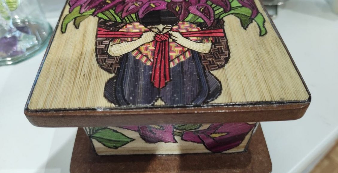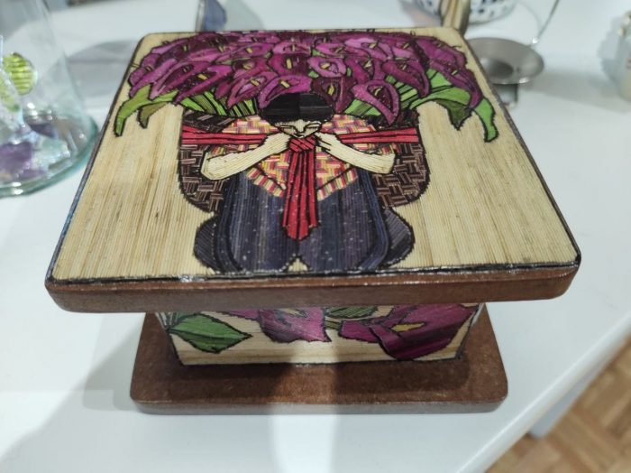 Con creatividad y portadora de conocimientos ancestrales, realiza cuadros, cajas, espejos, libretas, separadores, imanes y cualquier tipo de trabajo especializado, siendo los retratos un gran reto para ella, por su gran destreza y precisión en los detalles.
