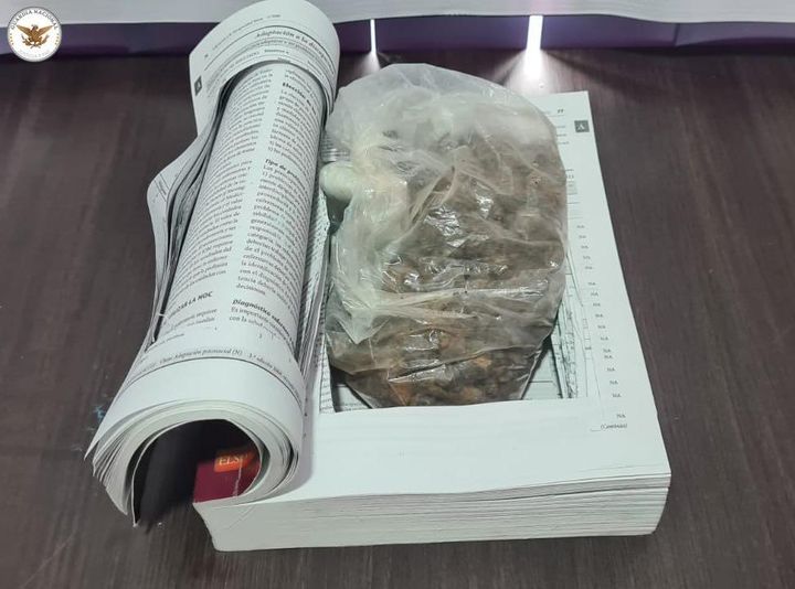 Elementos de la Guardia Nacional (GN) hallaron y aseguraron aproximadamente 0.330 gramos de heroína en piedra, la cual estaba oculta entre las hojas recortadas de un libro, informaron las autoridades policíacas.
