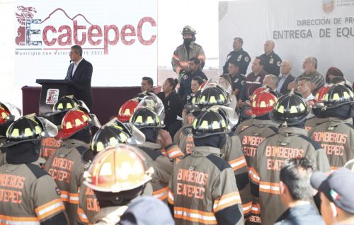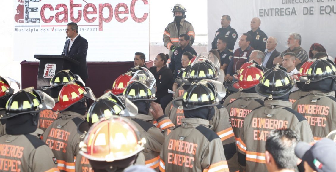 “Ahí están los impuestos de la gente de Ecatepec”, aseguró en alusión a los nuevos equipos de protección personal, de menos de 13 kilogramos de peso y que consisten en casco, monjas (capuchas especiales para cubrir el rostro), pantaloneras, botas y dos pares de guantes, uno para incendios y otro para rescate.
