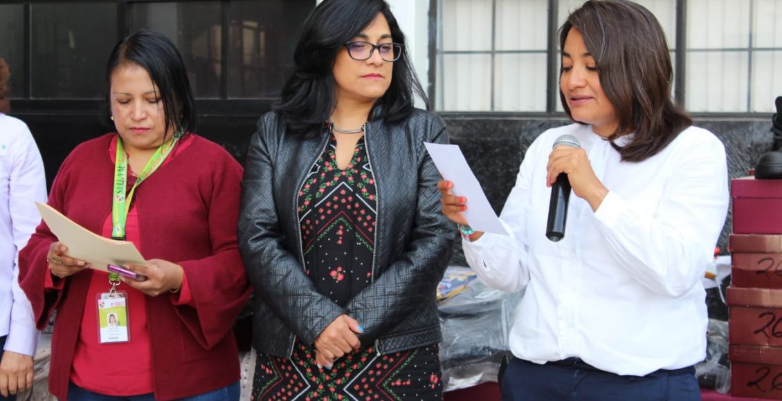 En el patio del ayuntamiento, Sandra Luz Falcón reconoció el trabajo de la dirigente municipal del Sindicato Único de Trabajadores del Estado de México y Municipios (SUTEyM) Martha Isabel Velázquez Gómez, quien se ha mantenido atenta a las negociaciones con el gobierno municipal, realizando un trabajo coordinado en beneficio de los trabajadores.