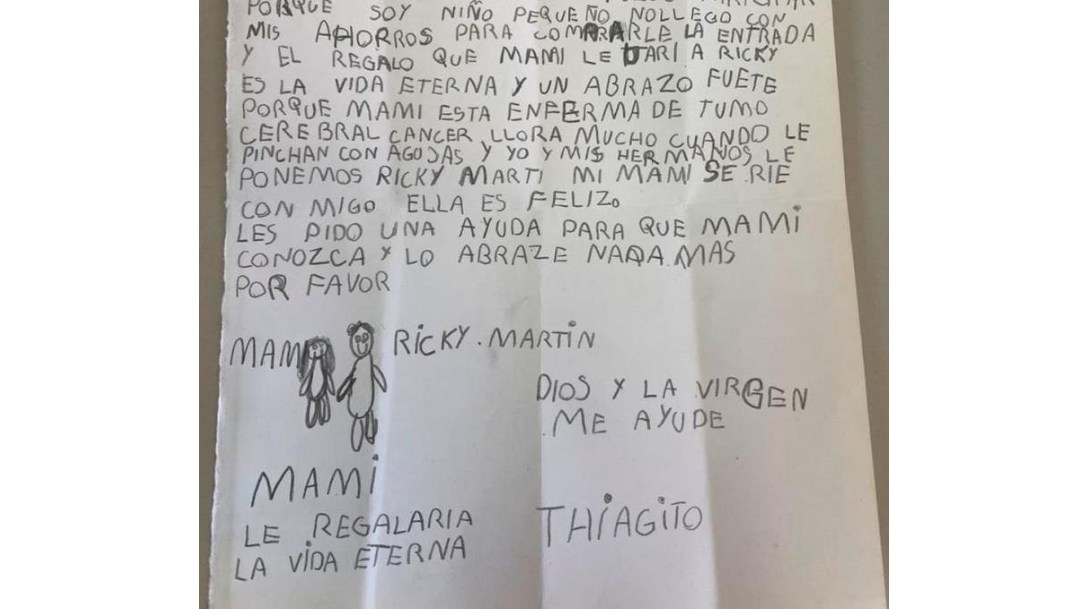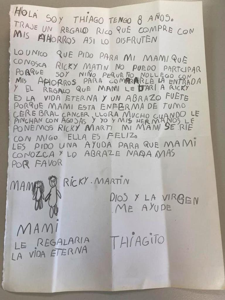 Thiago, un niño de 8 años, gastó sus ahorros para intentar que su mamá, quien padece cáncer, conociera a Ricky Martin con la ayuda de un programa de televisión.