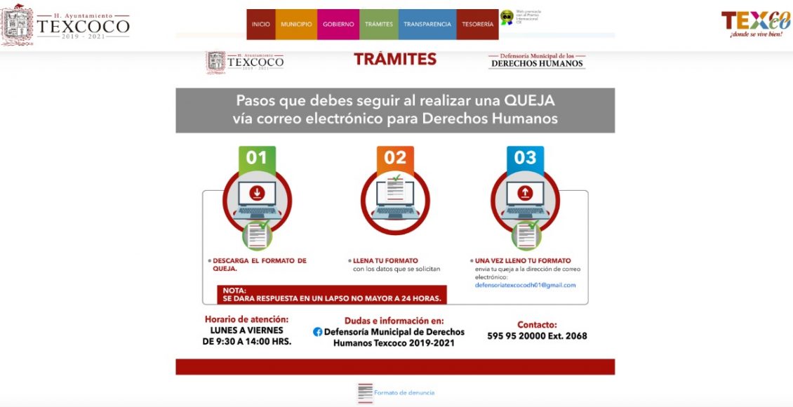 Explicó que la Presidenta Municipal Sandra Luz Falcón Venegas, se ha mantenido atenta al impulso de esta iniciativa, considerando que los ciudadanos que tengan alguna queja o denuncia, lo puedan hacer en a través de la página del gobierno municipal www.texcocoedomex.gob.mx, en donde se ha instalado un botón para tener acceso a los formatos de queja, así como su envío a la Defensoría Municipal de Derechos Humanos.