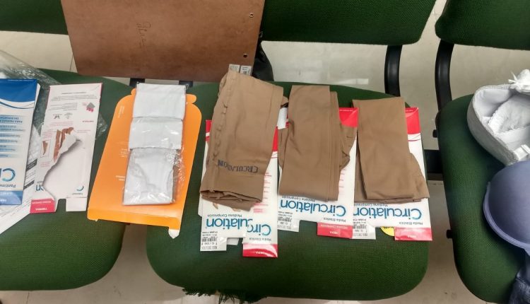 Al intentar salir por la caja 18, uno de los encargados le impidió el paso y le solicitó que por favor sacara toda la mercancía que intentaba llevarse sin haberla pagado. El implicado lo negó, pero al sentirse presionado, accedió y esto fue lo que intentó llevarse; un brassiere color piel marca rosy gold talla 36B, 1 brassiere color violeta marca rosy gold talla 38B, 2 brasieres color blanco de la marca carnival talla 40B, 2 playeras de algodón de tirantes marca fruit of the loom, 3 medias marca circulation (dos color natural y unas negras), 1 pantimedias color natural marca circulation y 1 tobimedias color blanca marca circulation, así como una caja de cartón con la leyenda fruit of the loom 2 A-shirts, un estuche de cartón roto con la leyenda circulation pantimedia natural, tres estuches de cartón con la leyenda circulation media (dos natura y una negra), un estuche de cartón con la layenda circulation tobimedia blanco, una etiqueta de cartón desprendida con la leyenda carnival.