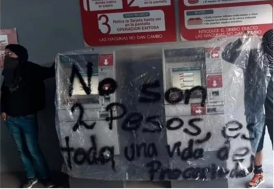 «No son dos pesos, es toda una vida de precariedad», escribieron los jóvenes sobre máquinas de pago de pasaje del Mexibús, en la estación Lechería, en protesta contra el incremento.