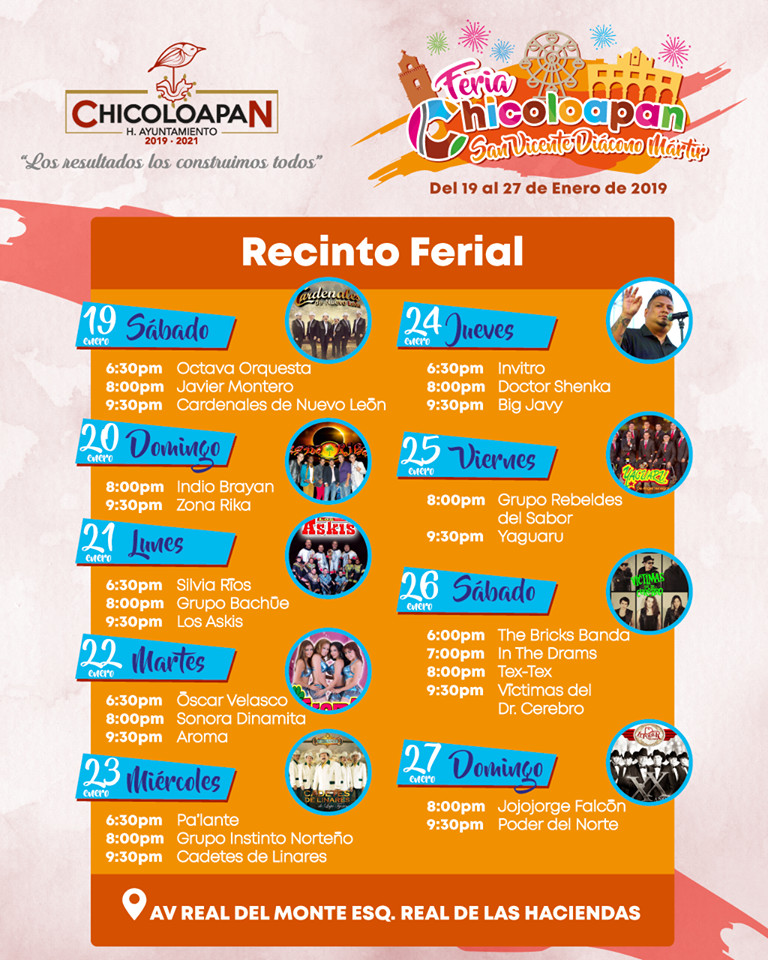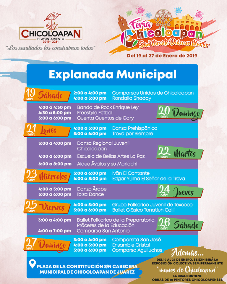 El Gobierno de la nueva admistración 2019-2021 y la alcaldesa Nancy Gómez celebran su fiesta patronal en honor a San Vicente Díacono y Martir, en de San Vicente Chicoloapan que se lleva a cabo desde el día 19 hasta el 27 de enero.