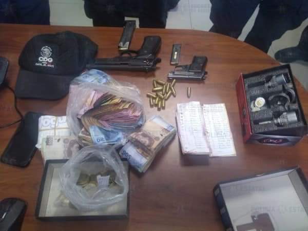 Elementos de la Secretaría de Seguridad (SS), que realizaban trabajos para inhibir y disuadir actos delictivos detuvieron, a siete sujetos por el probable delito de asalto a mano armada. Los implicados llevaban consigo dos armas de fuego y al momento de ser aprehendidos se les encontró dinero en efectivo por más de 140 mil pesos.