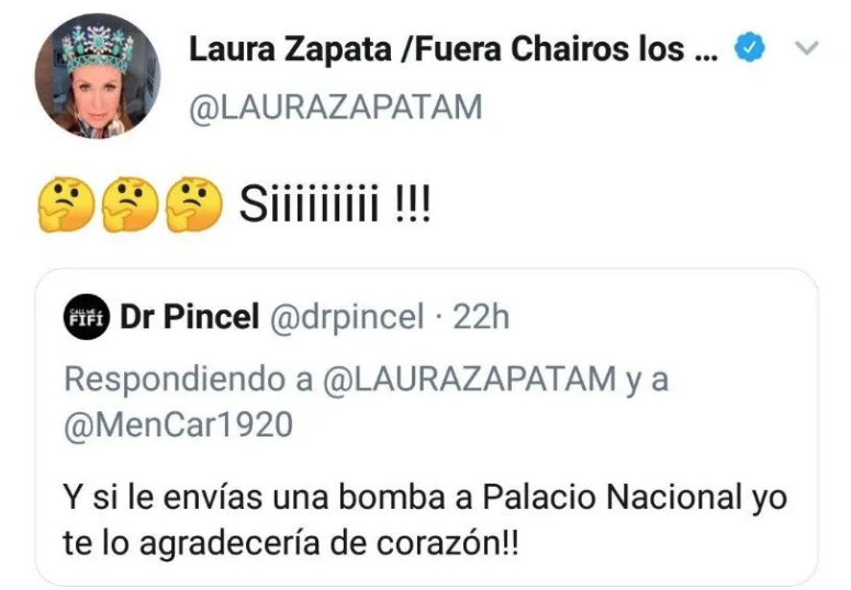 Todo comenzó debido a que la famosa compartió la petición que le hacía un seguidor al decirle que le enviara a AMLO una bomba a Palacio Nacional, algo a lo que Laura contestó positivamente.
