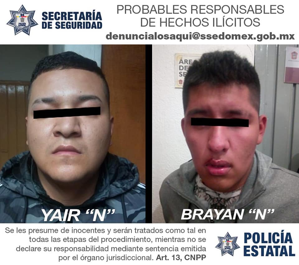 Los detenidos se identificaron como; Yahir “N” de 22 años de edad y Brayan Jacinto “N”, de 18 años de edad,  quienes fueron reconocidos plenamente por las víctimas, por lo que de inmediato fueron puestos a disposición de las autoridades ministeriales de la Fiscalía General de Justicia del Estado de México (FGJEM), donde se determinará su situación jurídica.