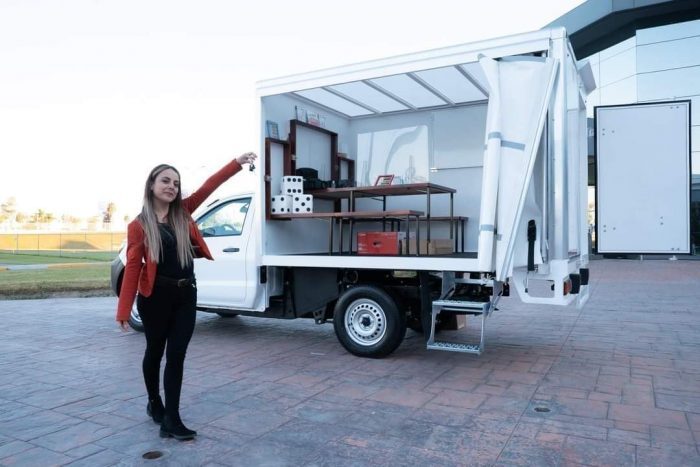 La camioneta está adaptada en su parte trasera como un salón de clase, cuanta con escalera tipo retráctil para fácil acceso, conexiones eléctricas, bancas y mesas abatibles, un equipo multifuncional, proyector inalámbrico, tablet y kit de higiene.