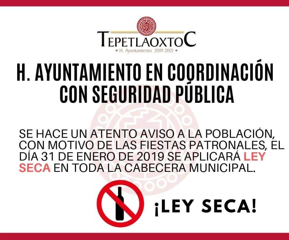 “Se informa a la comunidad en general que la LEY SECA se implementará desde las 12:00 am del día Jueves 31 de ENERO hasta las 12:00 am del día Viernes 1ro de FEBRERO del 2019.Toma tus precauciones.”