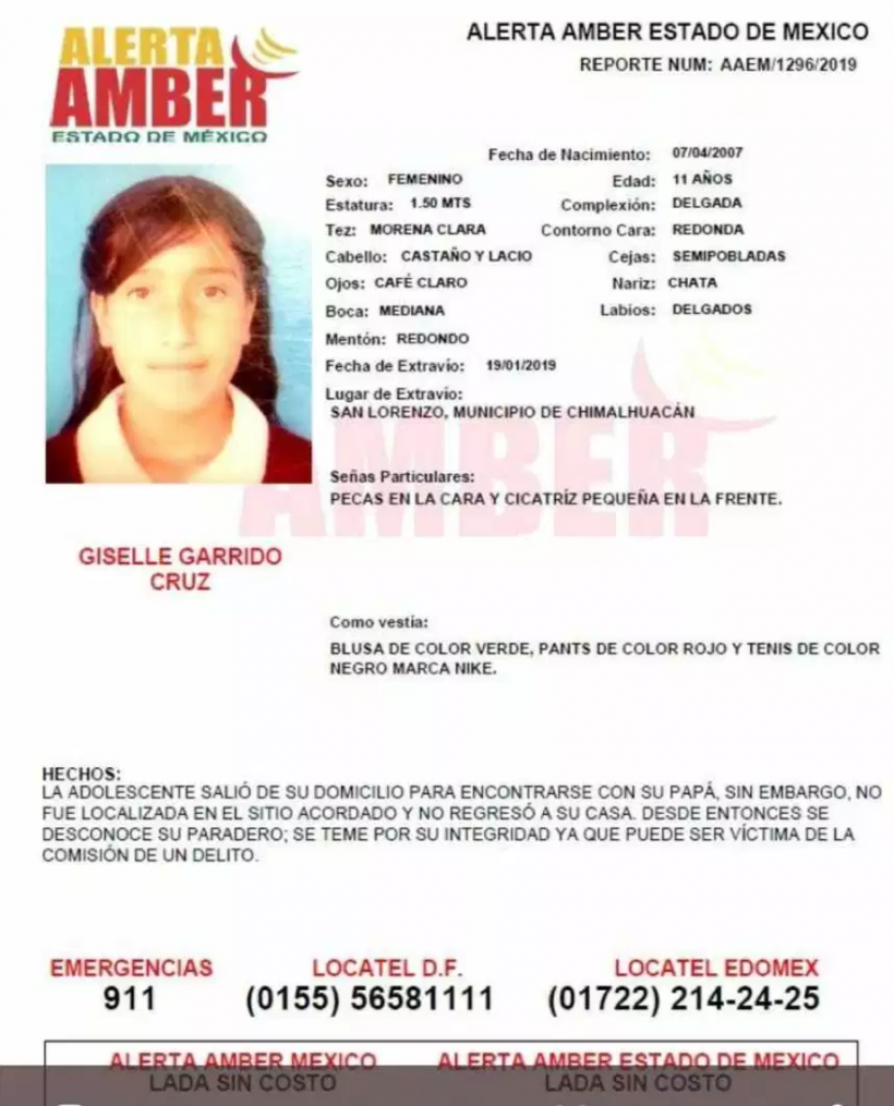Este fin de semana desapareció Giselle Garrido Cruz una niña de 11 años en Chimalhuacán, en el barrio de San Lorenzo luego de haber ido a un cibercafé para poder hablar con su padre.