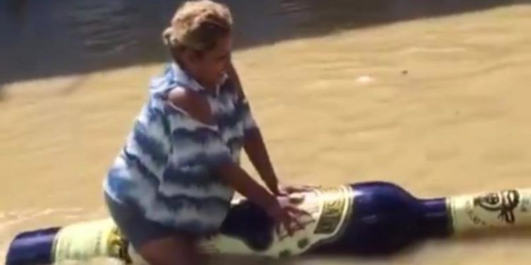 ??¡En el mar, la vida es más sabrosa! Así se divirtieron por algunos minutos los vecinos #Tabasco, cuando una mujer recorría las calles inundadas a bordo de un inflable de botella de tequila. Más información en https://t.co/Mho6zzYjnK pic.twitter.com/yW7P9oOkLV