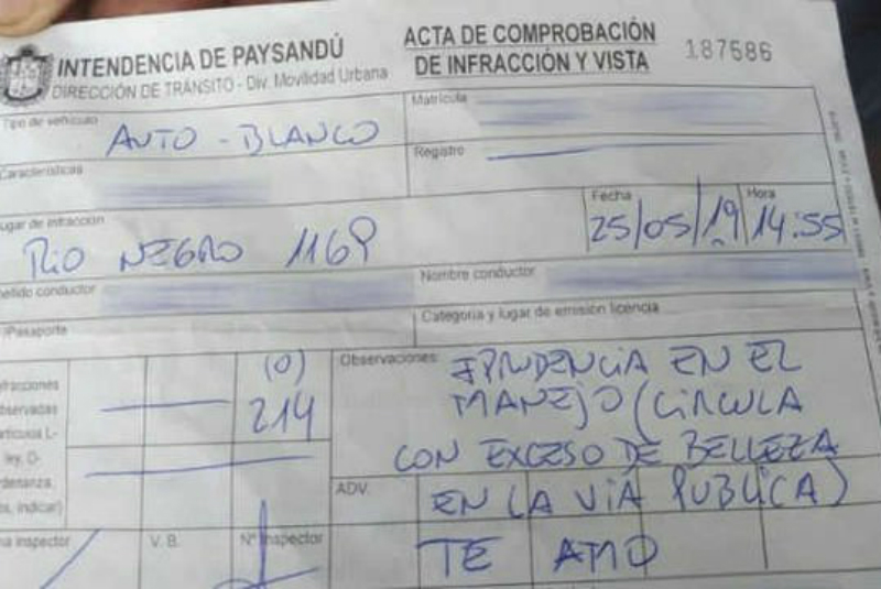 El pasado 25 de mayo, un inspector de tránsito multó a una mujer por » circular con exceso de belleza en la vía pública», en la intendencia de Paysandú, Uruguay.