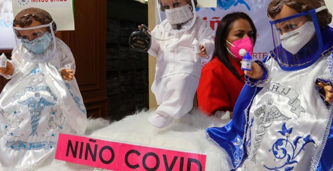 La pandemia por Covid-19 obligó a que el niño Dios también se vistiera con cubrebocas y careta, incluso con trajes de protección Covid completos, que ahora están agotados, afirmó Alma Rosa Gómez Arizmendi, artesana del mercado «16 de septiembre» en el centro de Toluca.