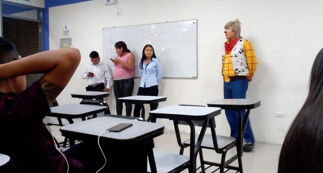 Raúl Rivera, estudiante de Derecho de la Universidad de San Pedro Huacho, en Perú, se volvió viral gracias a una foto en la que aparece vestido de payaso mientras expone en el salón de clase.