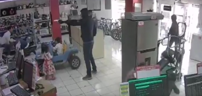 A través de un video que fue compartido en redes sociales, los cinco delincuentes llegaron a la casa de empeño con pistola en mano y amagaron al personal, los clientes que estaban en el lugar corrieron a esconderse, mientras que dos pequeños, de no más de cinco años, quedaron entre unos carros de juguete que estaban en el pasillo, quedando en medio de los asaltantes y el personal de seguridad de la tienda, que se enfrentaban a balazos.