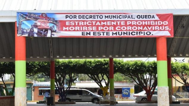 “Por decreto municipal, queda estrictamente prohibido morirse por coronavirus, en este municipio”, dice la lona.