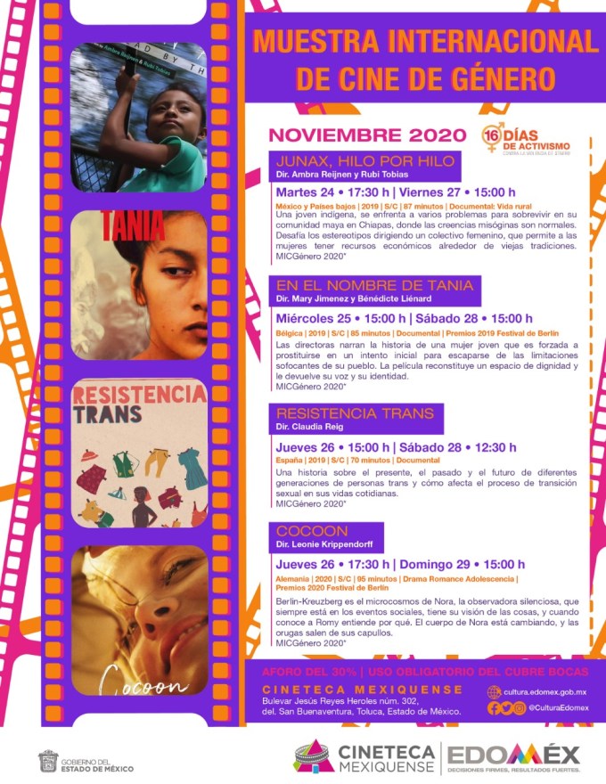 De ahí, que sea el 25 de noviembre cuando conmemoramos este día de lucha que busca crear conciencia en nuestra sociedad para transformar de manera positiva la realidad en que vivimos; en este sentido la Secretaría de Cultura y Turismo, a través de su Unidad de Género y Erradicación de la Violencia y en coordinación con la Cineteca Mexiquense, presentan la Muestra Internacional de Cine con Perspectiva de Género.