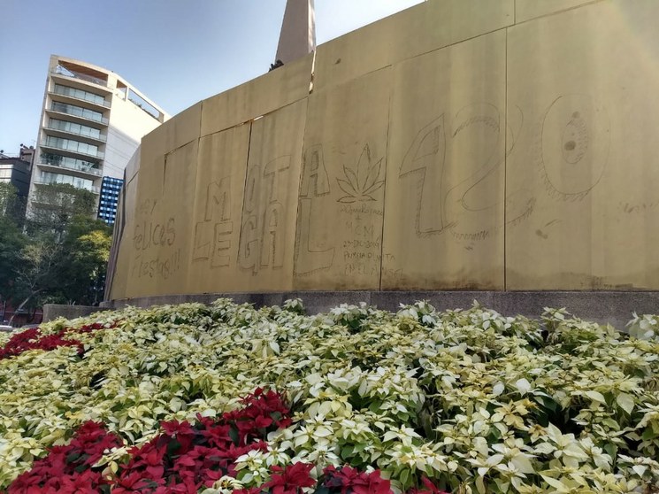 Los activistas colocaron la yerba en el monumento de la Victoria Alada, junto con el monto de noche buenas que colocó el gobierno de la Ciudad de México como parte de las fiestas decembrinas.