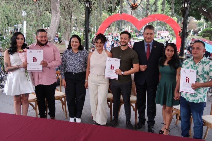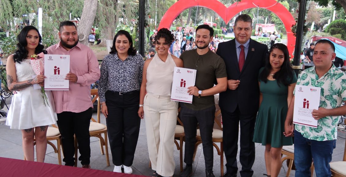 El kiosco del jardín municipal de Texcoco fue el escenario en donde tres parejas que participaron en la dinámica “Cásate en el Corazón de Texcoco”, sellaron su compromiso matrimonial ante la sociedad este 14 de febrero.