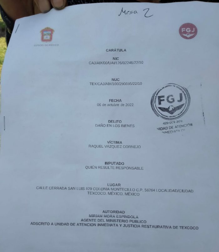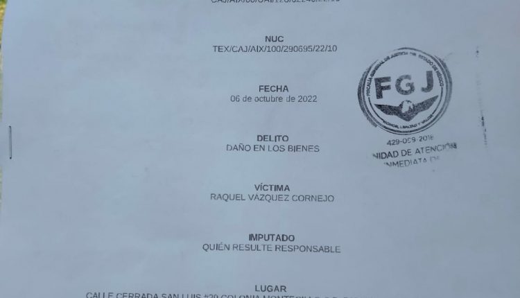 Manifestó que al acudir al Ministerio Público para realizar la denuncia correspondiente por la agresión y el incendio y al señalar a su hermano se levantó carpeta TEX/CAJ/AIX/100/290695/22/10; sin embargo, los servidores públicos se negaron a colocar el nombre de su familiar y fue iniciada en contra de «quien resulte responsable».