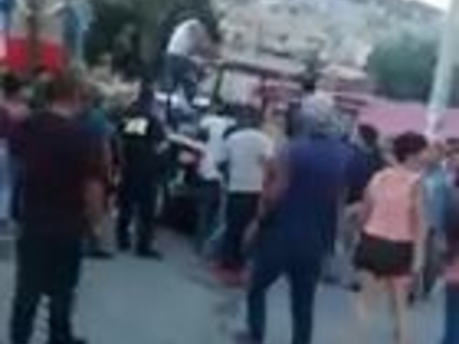 Sin embargo, los oficiales fueron rebasados por los vecinos, quienes impidieron que se retirara la unidad que quedó a mitad de la calle con la torreta encendida, mientras que enardecidos se subían a la batea para golpear a los jóvenes.