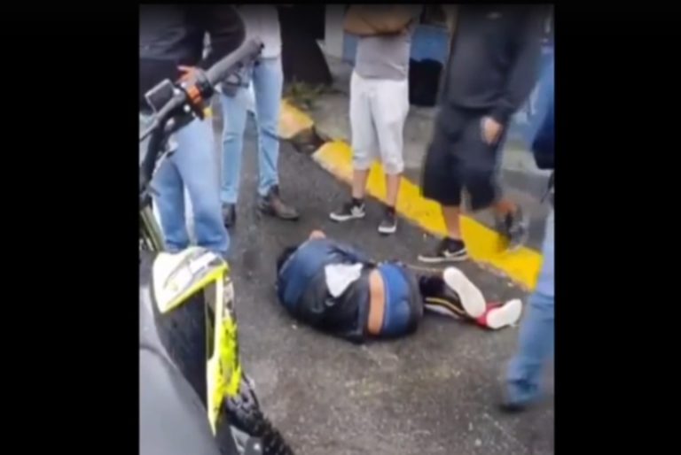Un video comenzó a circular por medio de las redes sociales se puede ver como el presunto delincuente esta tirado en el asfalto, a tal punto que comienza a llorar mientras que los vecinos lo golpean amenazándolo con quemarlo.